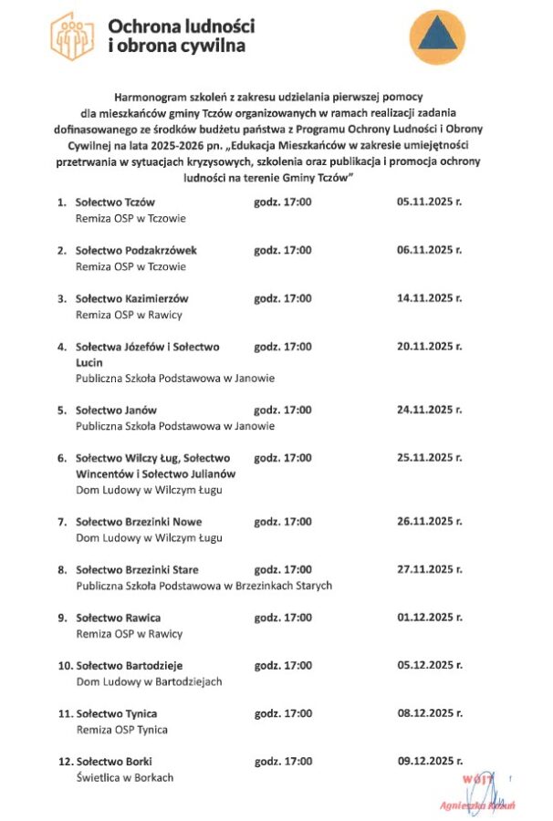 Szkolenia realizowane są w ramach zadania dofinansowanego ze środków budżetu państwa z Programu Ochrony Ludności i Obrony Cywilnej na lata 2025–2026 pod nazwą „Edukacja mieszkańców w zakresie umiejętności przetrwania w sytuacjach kryzysowych, szkolenia oraz publikacja i promocja ochrony ludności na terenie Gminy Tczów”.