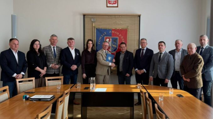 W sali narad Starostwa Powiatowego w Zwoleniu odbyło się oficjalne podpisanie umowy z wykonawcą inwestycji. Dokumenty przekazał prezesowi firmy TRAKT S.A., Andrzejowi Gieradzie, starosta zwoleński Andrzej Skorek. W wydarzeniu uczestniczyli przedstawiciele władz samorządowych, w tym wicestarosta Kinga Kołaga, przewodniczący Rady Powiatu Edward Rybak wraz z zastępcą Grzegorzem Papisem, a także członkowie Zarządu Powiatu: Mirosław Chołuj i Piotr Fijołek. Obecni byli również burmistrz Zwolenia Arkadiusz Sulima, zastępca burmistrza Grzegorz Molendowski, wójt gminy Przyłęk Jerzy Kamionka oraz dyrektor Powiatowego Zarządu Dróg Tomasz Mordziński.