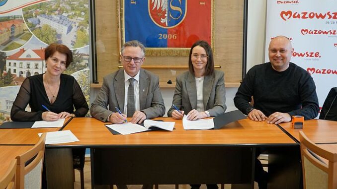 Zdjęcie przedstwia dwie kobiety i dwóch mężczyzn siedzących i podpisujących umowę w otoczeniu sztandaru Powiatu Zwoleńskiego i rollupów Powiatu Zwoleńskiego i Mazowsza