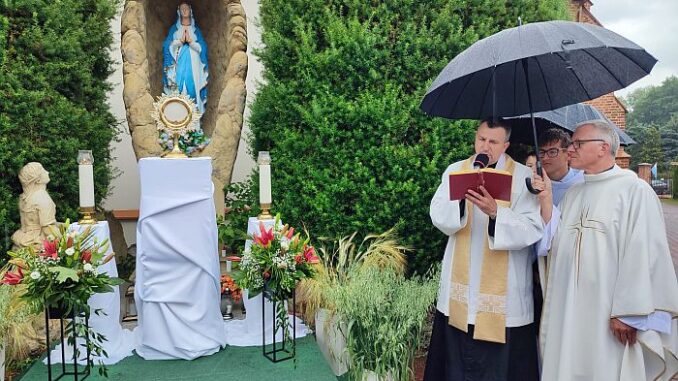 W czwartek, 19 czerwca 2025 roku, parafia pw. Podwyższenia Krzyża Świętego w Zwoleniu przeżywała jedno z najważniejszych wydarzeń w roku liturgicznym – uroczystość Najświętszego Ciała i Krwi Chrystusa, powszechnie znaną jako Boże Ciało. Mimo niesprzyjających warunków atmosferycznych – opadów deszczu i chłodu – licznie zgromadzeni wierni nie zrezygnowali z udziału w procesji eucharystycznej ulicami miasta.
