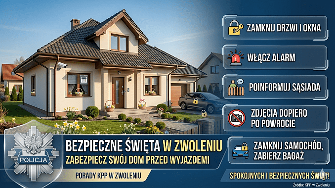 Okres Świąt Wielkanocnych to czas wzmożonych wyjazdów i odwiedzin u bliskich. Pozostawione bez opieki domy i mieszkania stają się jednak łatwym celem dla złodziei. Policjanci z Komendy Powiatowej Policji w Zwoleniu apelują o rozwagę i przypominają o kilku kluczowych zasadach, które pozwolą zminimalizować ryzyko kradzieży i zapewnią spokojny powrót z wypoczynku.
