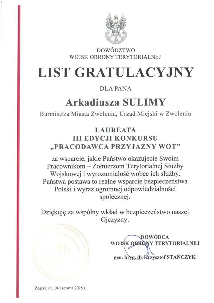 Zwoleński samorząd od lat angażuje się w działania na rzecz współpracy z formacjami mundurowymi. Wyróżnienie w konkursie „Pracodawca Przyjazny WOT” to nie tylko dowód uznania, ale także impuls do dalszych wspólnych inicjatyw, służących zarówno społeczności lokalnej, jak i bezpieczeństwu narodowemu.